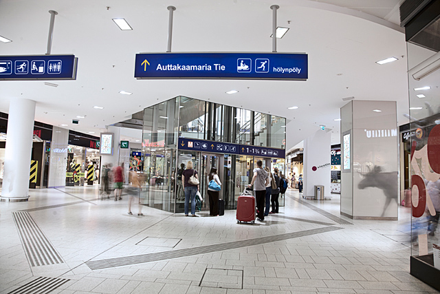 Vertraute Leitsystemelemente, Geschäftsschilder und Logos in finnischer Sprache.