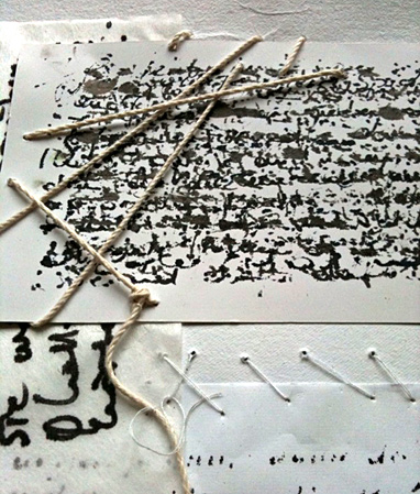 Gedanken im Kopf, sind auch die Textauszüge ineinander sprunghaft verwebt und verbunden per Faden und Zwirn –