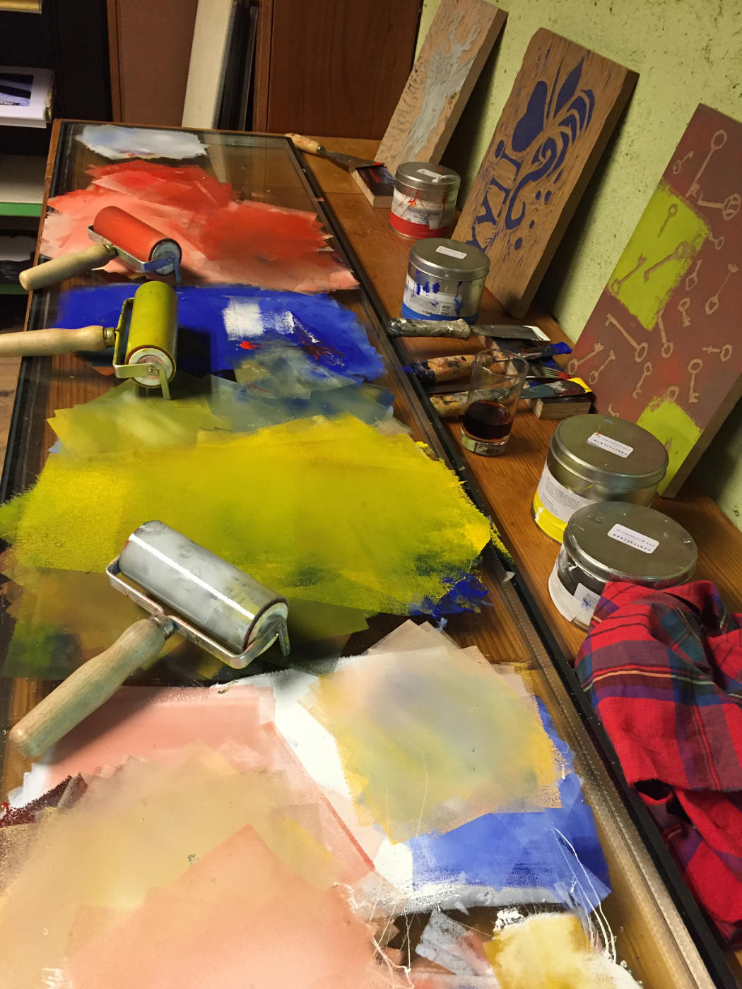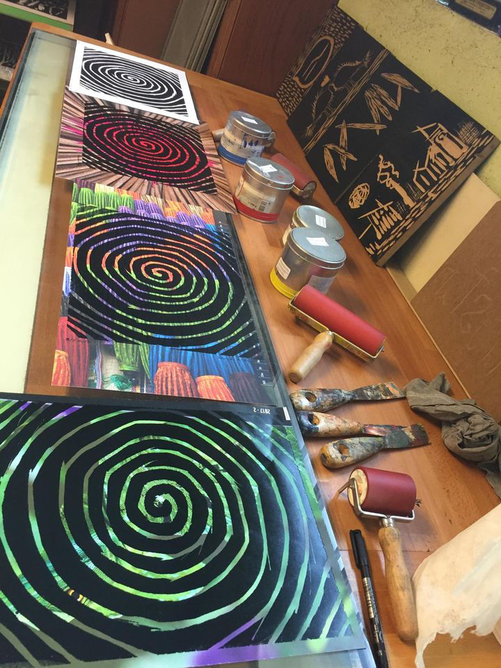 Wir werden von deiner Holzplatte eine Serie an Drucken anfertigen und mit Farben und unterschiedlichen Papieren experimentieren.