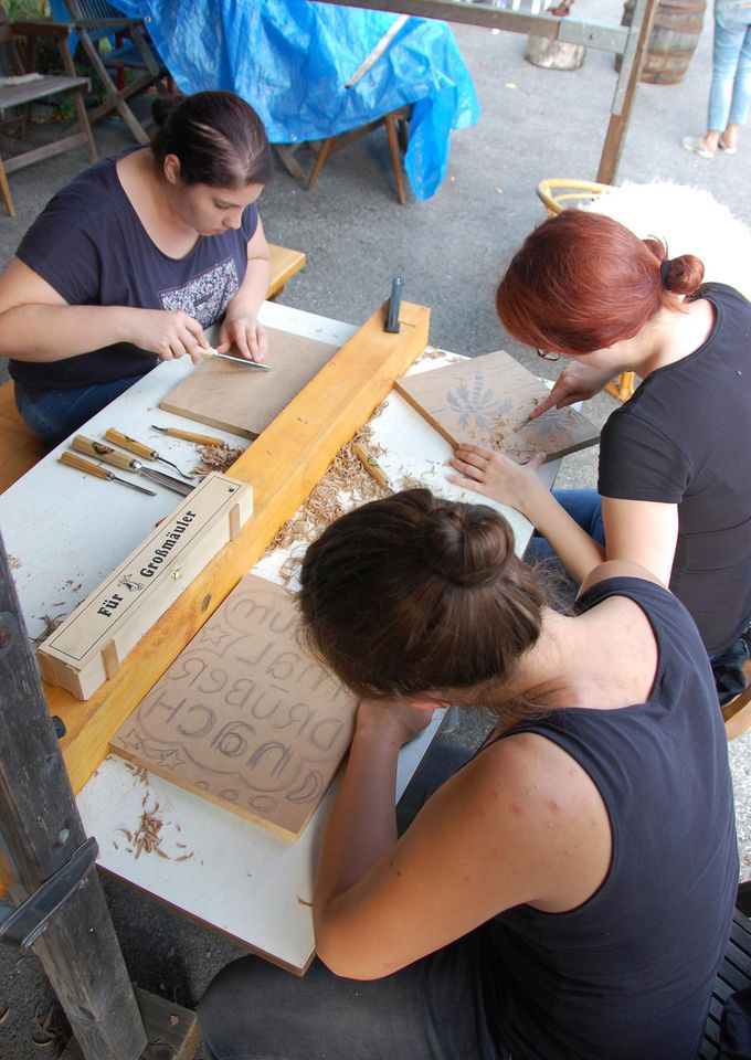 Im nächsten Schritt wird die Holzplatte mit den entsprechenden Schnitzwerkzeugen bearbeitet und die notwendigen Vertiefungen aus dem Holz herausgearbeitet.