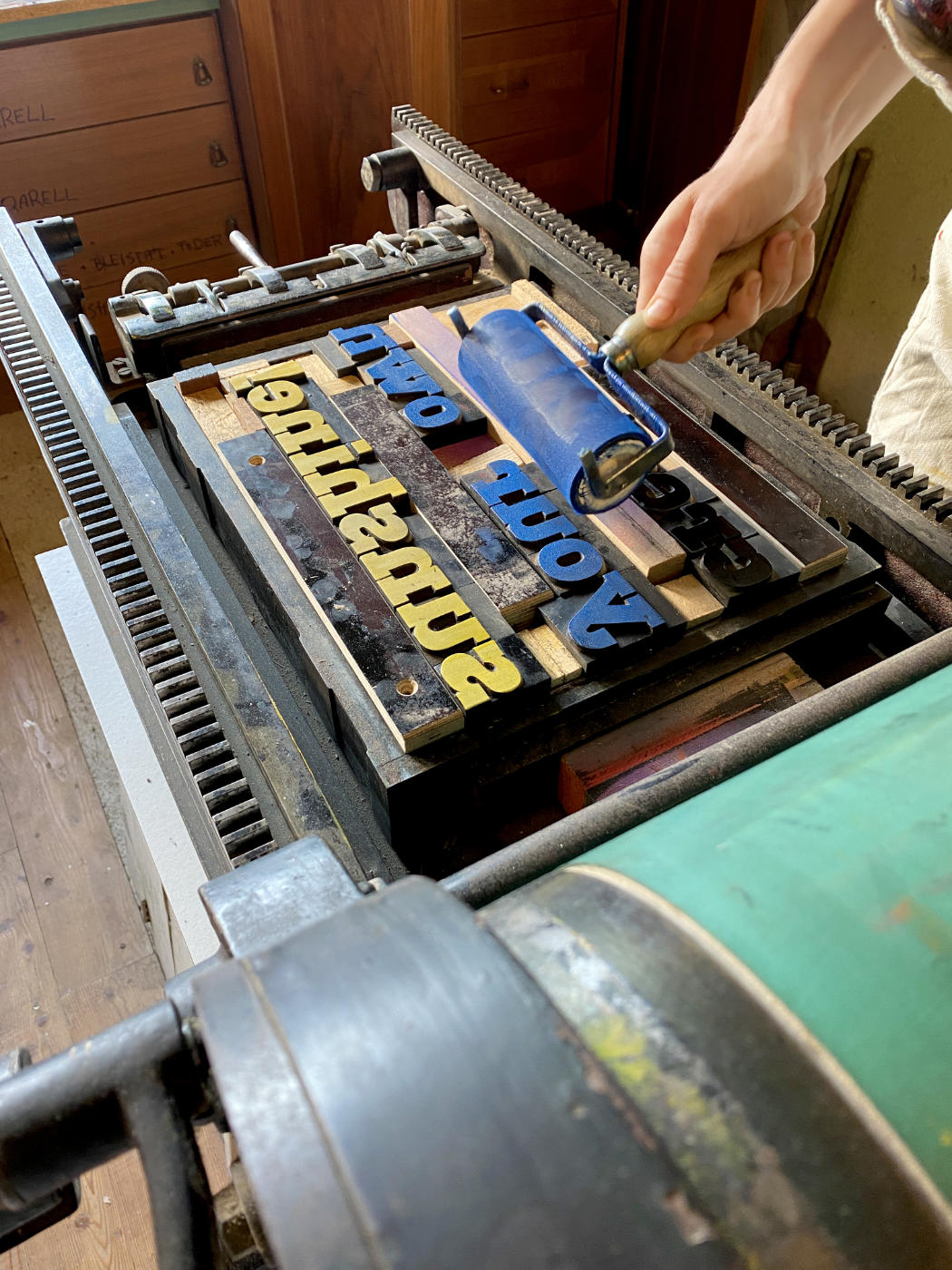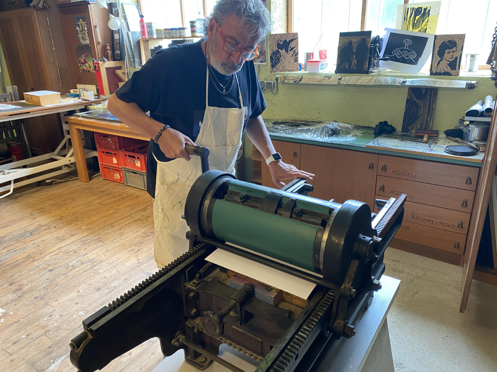 Am Nachmittag gehts mit der bearbeiteten Platte dann ab zur Druckpresse und wir erstellen den ersten Probedruck - der wohl spannendste Moment.