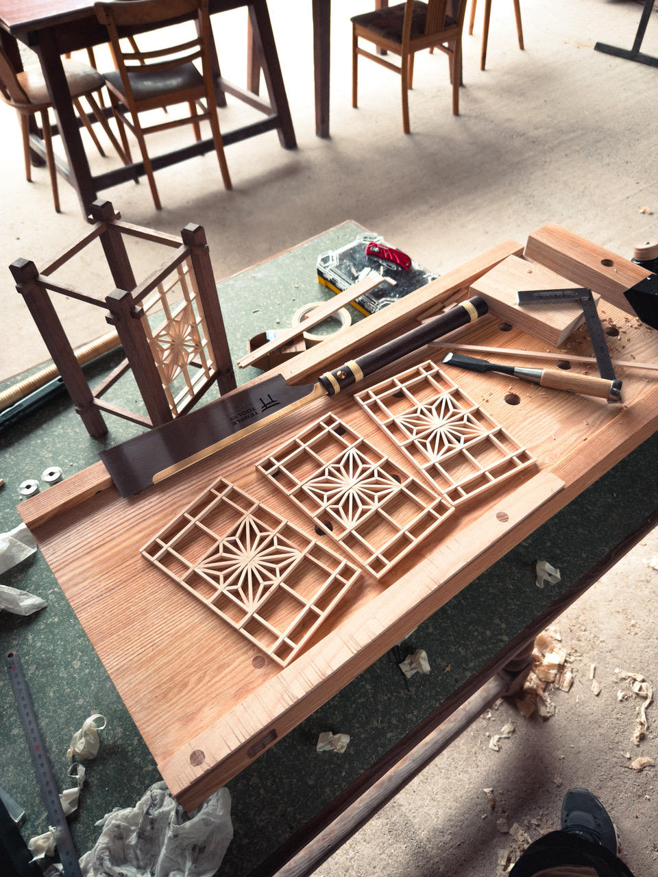 Hochwertige japanische Handsägen, Stemmeisen und alle benötigten Hölzer werden gestellt. Du arbeitest mit professionellem Equipment, das dir ein erstklassiges Ergebnis ermöglicht.